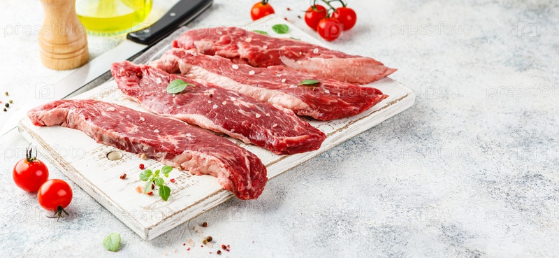 Три куска стейка из сырой говядины на деревянной разделочной доске, нож, соль, перец, помидоры и масло в бутылке на светлом фоне. Мясо высшего сорта, стейк блэк ангус. Место для текста. Длинный широкий баннер