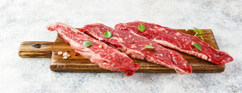 Сырой стейк со специями на деревянной разделочной доске