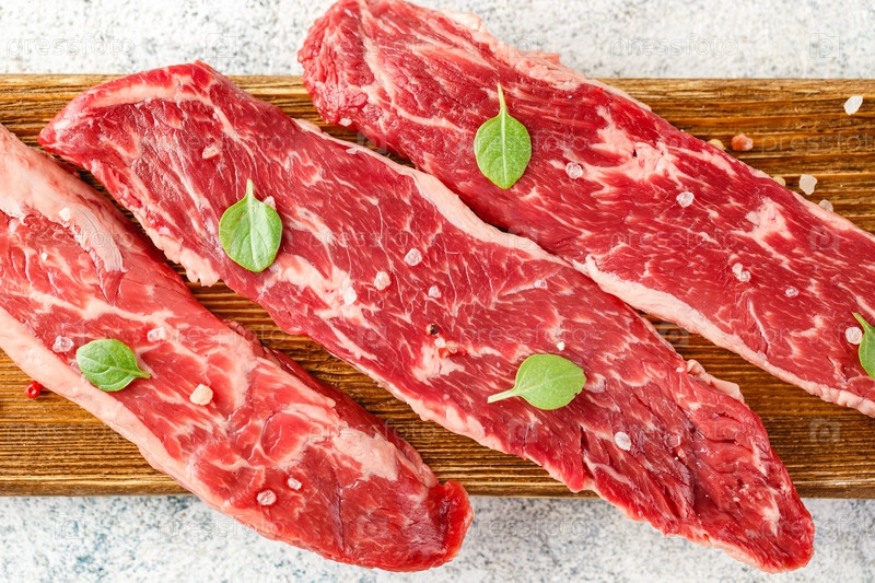 Сырой стейк со специями на деревянной разделочной доске