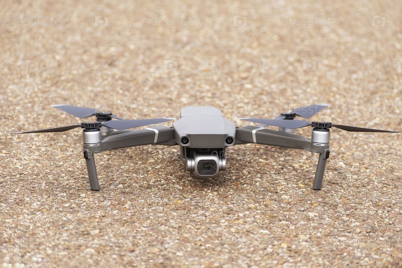 Маленький квадрокоптер (дрон) стоит на асфальтовой дорожке и готовится к взлету. Новые технологии аэрофотосъемки и наблюдения с воздуха