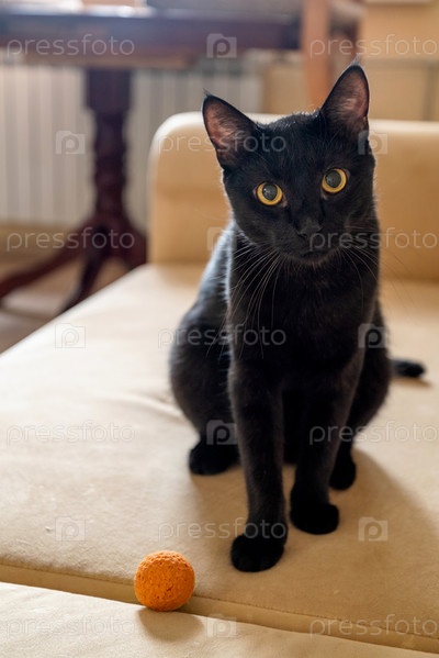 Милый черный кот с любопытством приглашает своего хозяина поиграть в мяч