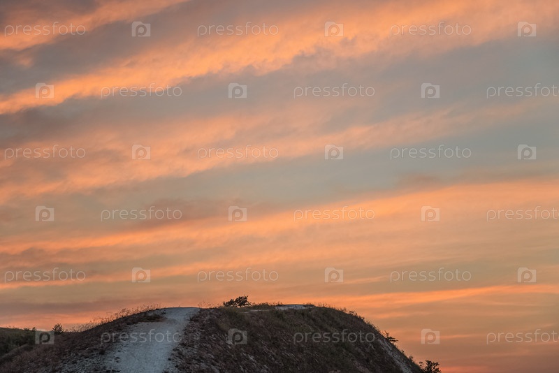 Вершина холма под драматическим небом с розовыми облаками на закате