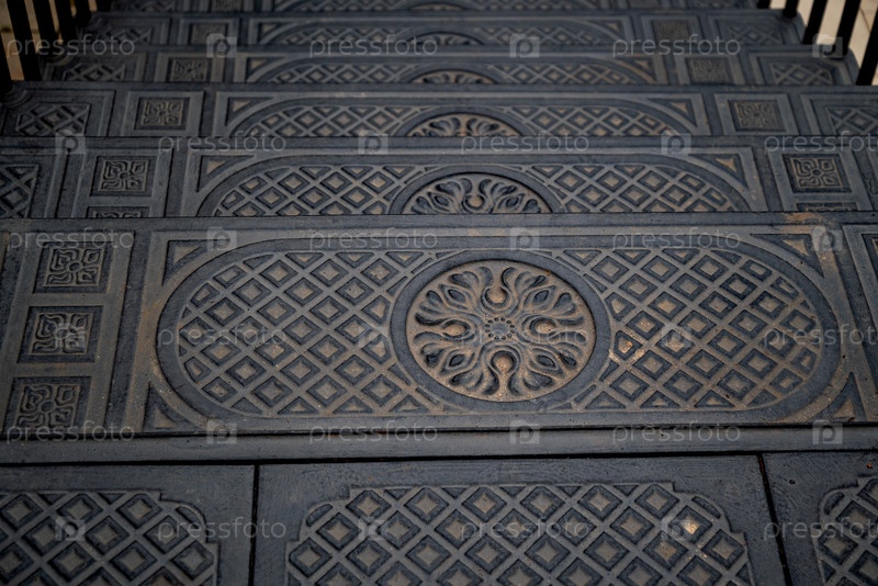 Богато украшенный узор на винтажных металлических ступенях кованой лестницы