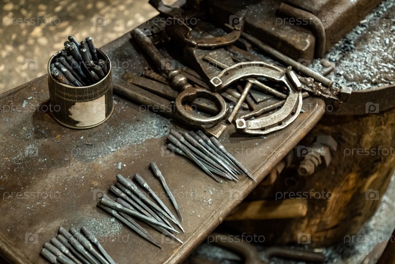 Рабочие инструменты, гвозди и металлическая подкова на поверхности стола в кузнице