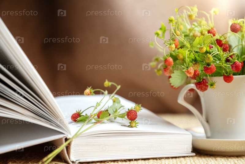 Открытая книга, лежащая рядом с летней связкой веточек земляники с красными ягодами в кружке белого чая