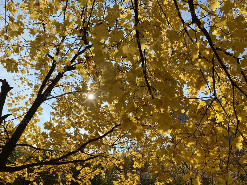Желтые кленовые листья на дереве в сухой солнечный осенний день