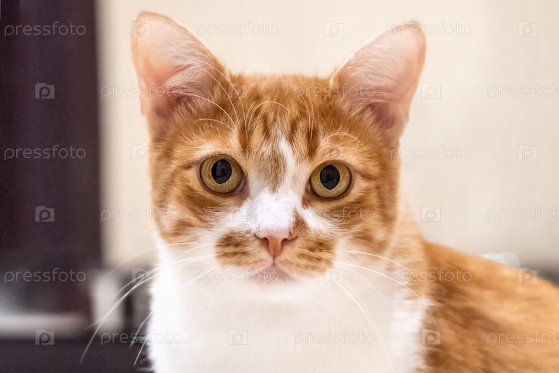 Милый красно-белый кот с портретом больших желтых глаз