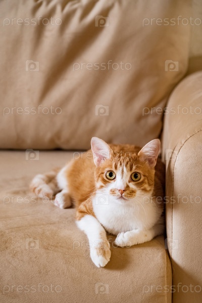Милый бело-рыжий кот с желтыми глазами лежит на диване крупным планом портрет