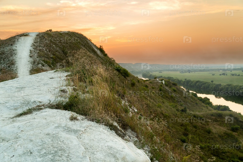 Вершина холма под розовым драматическим небом с перьевым облаком закатный пейзаж