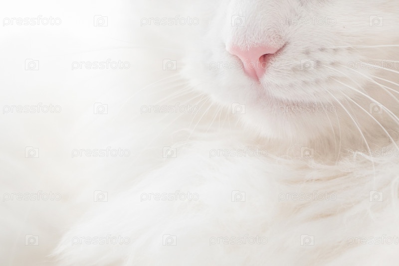 Белая пушистая кошка закрывает морду, фокусируется на розовом носу