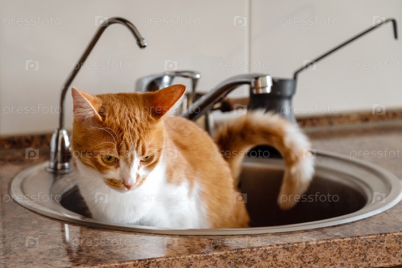 Забавный рыжий кот сидит в кухонной раковине