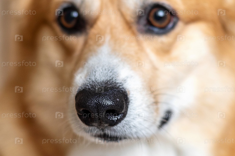 Крупным планом лицо рыжей собаки Пемброк Вельш Корги, избирательный фокус на носу