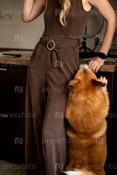 Забавная собака прыгает, выпрашивая лакомство у хозяина
