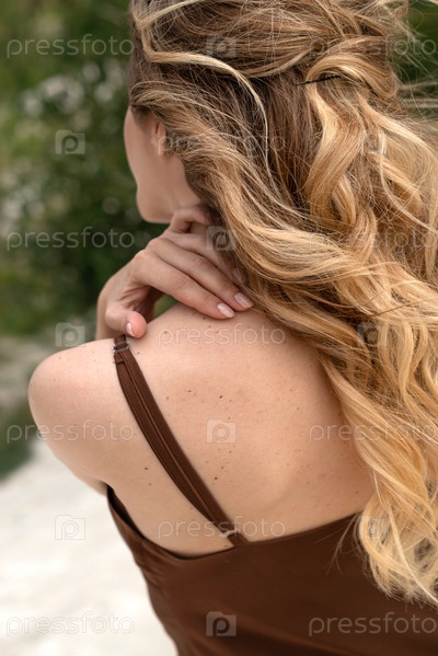 Молодая женщина с длинными светлыми волосами, спутанными ветром, в коричневом шелковом платье позирует стоя отвернувшись
