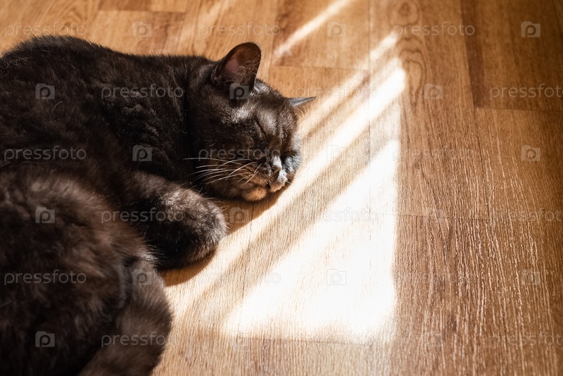 Милый кот спит на полу под солнечным светом