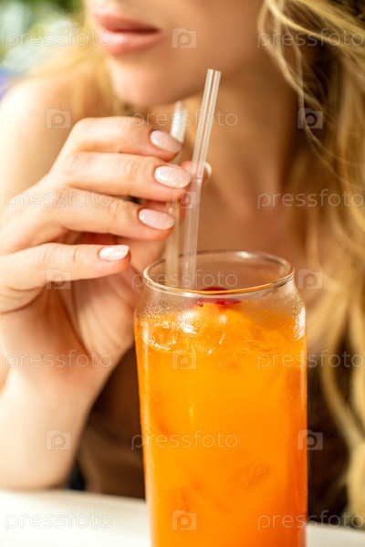 Молодая женщина пьет фруктовый коктейль, свежевыжатый сок или освежающий напиток и держит пальцами соломинку