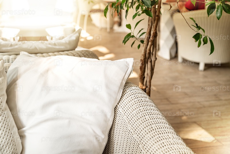 Диван из ротанга с подушкой в патио в стиле бохо
