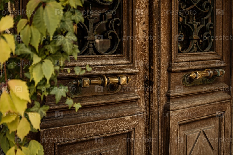 Выветренная и поцарапанная старая деревянная дверь с металлическими ручками крупным планом