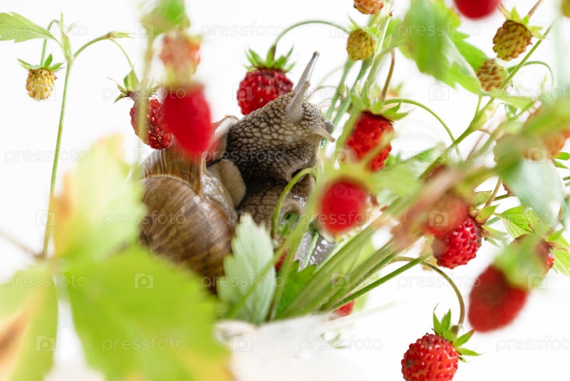 Улитка ползает по веткам земляники с красными спелыми ягодами