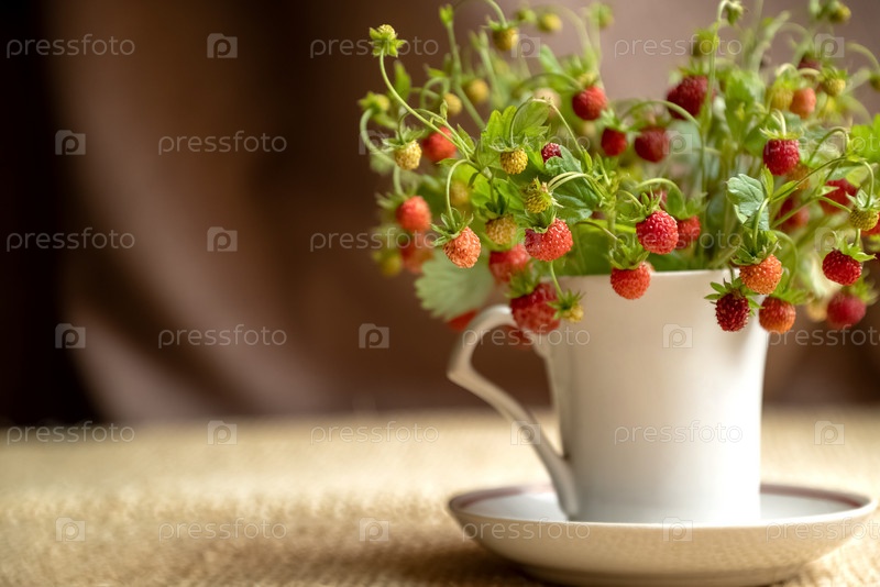 Куча веток дикой клубники с красными спелыми ягодами в кружке белого чая летний букет крупным планом