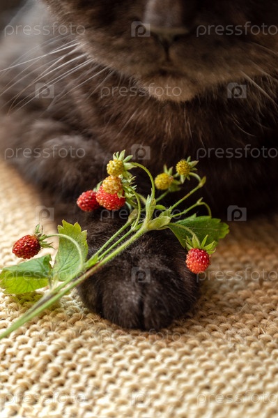 Веточки дикой клубники с красными спелыми ягодами, лежащими на кошачьей лапе крупным планом