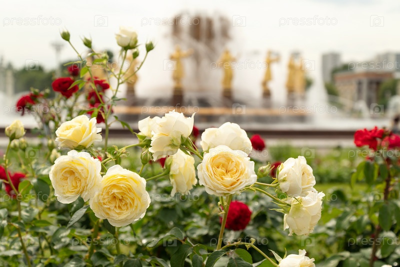 Цветущие белые и красные кусты роз в парке в летний день