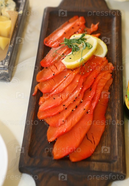 Семга соленая с лимоном на деревянном фоне
