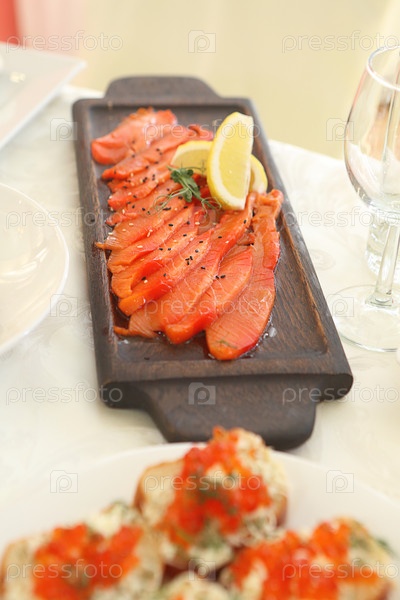 Семга соленая с лимоном на деревянном фоне