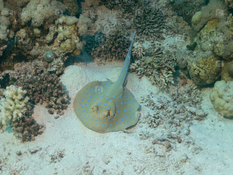 Голубой пятнистый скат или Taeniura lymma в глубине Красного моря, концепция путешествия