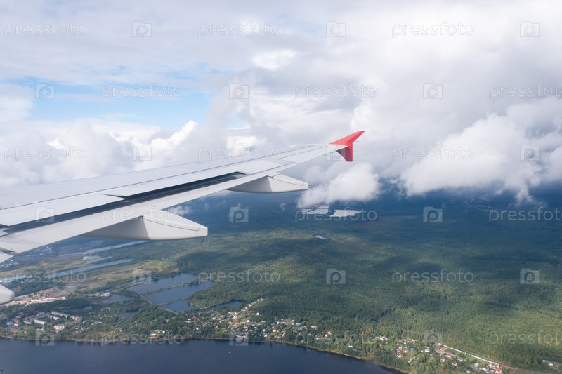 Вид на белые облака и Землю из иллюминатора самолета