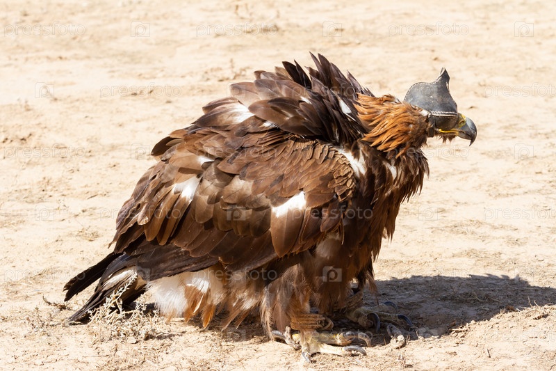 Золотой орел или Aquila chrysaetos сидит перед охотой в степи, Кыргызстан