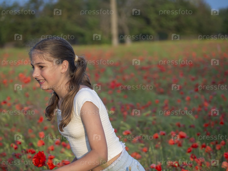 Девушка с длинными волосами бежит по полю с цветами мака. Улыбающаяся девочка-подросток на отдыхе на природе на лугу с красными цветами мака