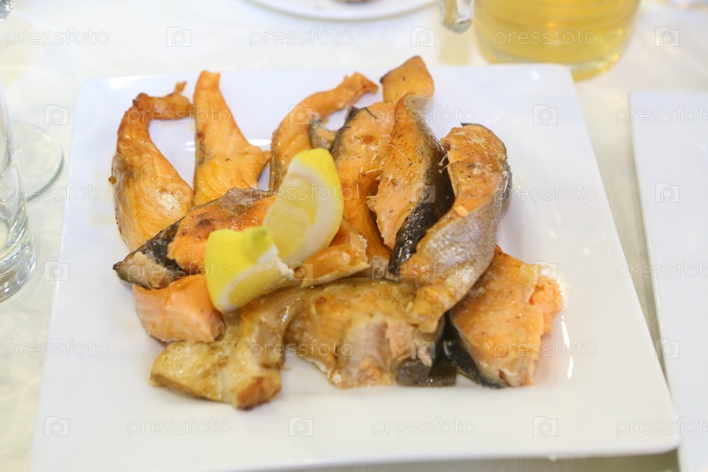 Жареная семга с лимоном на белой тарелке