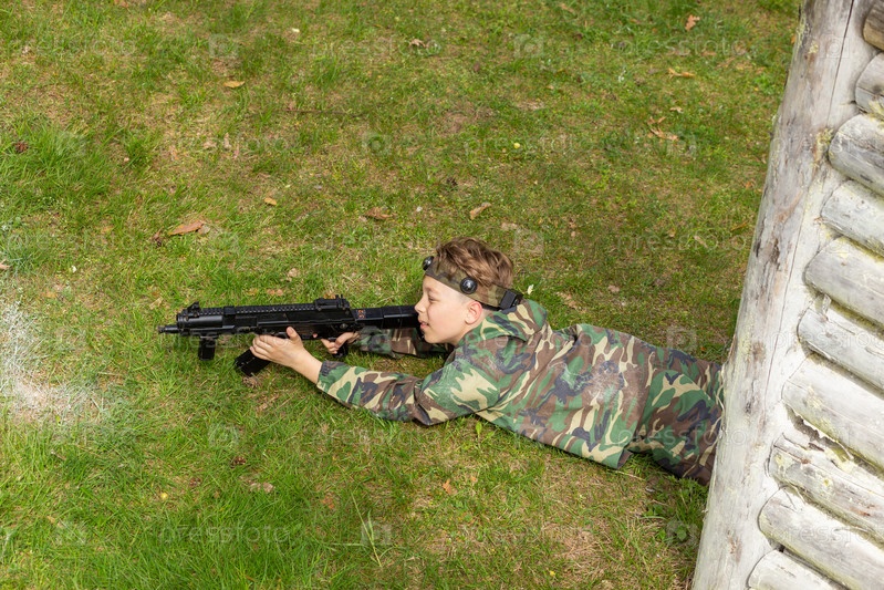 Мальчик в камуфляже играет в лазертаг на специальной лесной площадке. Лазертаг — это командная военно-тактическая игра с использованием безопасного лазерного оружия и датчиков, фиксирующих попадания