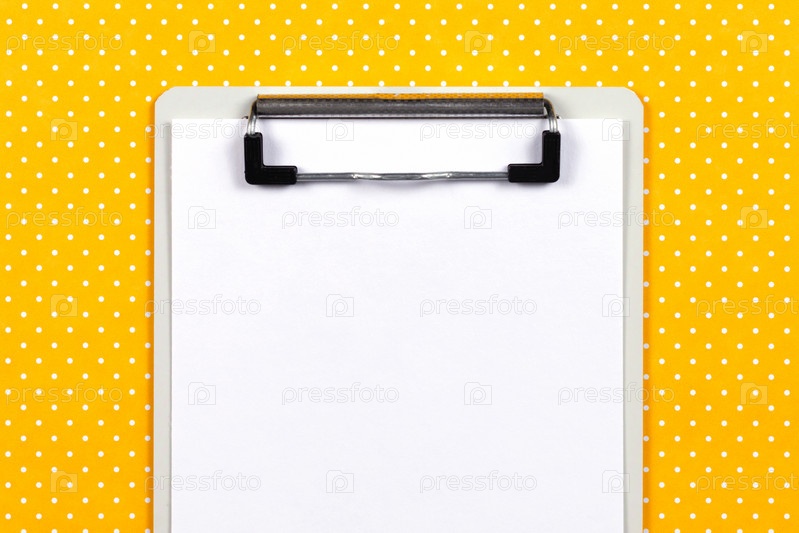 Буфер обмена с пустой бумажной карточкой на ярко-желтом фоне в горошек, пространство для копирования