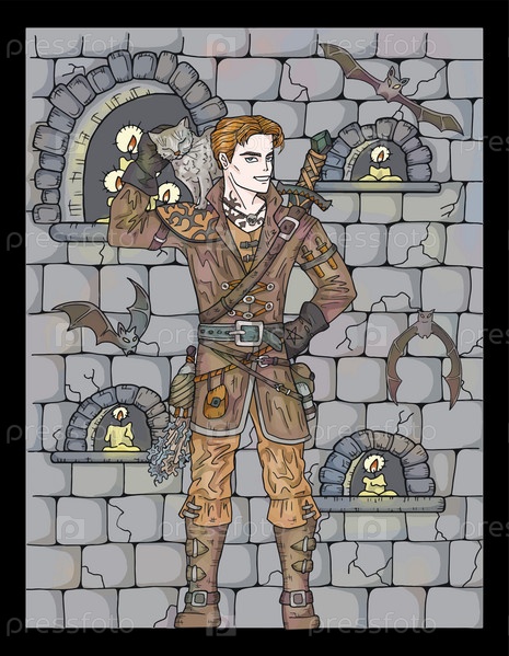Винтажная красочная иллюстрация с красивым охотником на вампиров на фоне старой средневековой каменной стены, романтический страшный фон Хэллоуина, рисованное вручную искусство с концепцией эзотерической фантазии