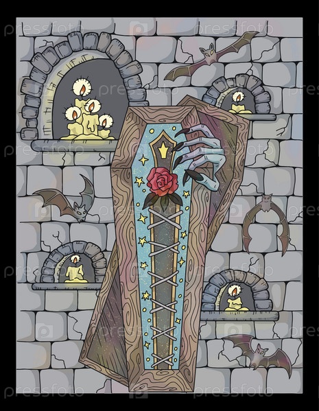 Винтажная красочная иллюстрация с гробом вампира на фоне старой средневековой каменной стены, романтический страшный фон Хэллоуина, рисованное вручную искусство с концепцией эзотерической фантазии