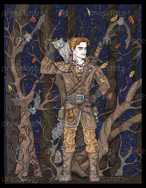 Винтажная красочная иллюстрация с красивым охотником на вампиров или воином в мрачном осеннем лесу с жуткими ветвями, романтическим страшным фоном Хэллоуина, нарисованным вручную искусством с концепцией эзотерической фантазии