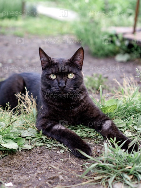 Черный кот лежит на траве и играет