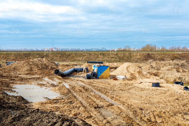 Соединение траншейного водостока с бетонной конструкцией люка на строительной площадке. Бетонная свая в каркасе опалубки для устройства ливневых и подземных коммуникаций, насосных станций, канализационных труб