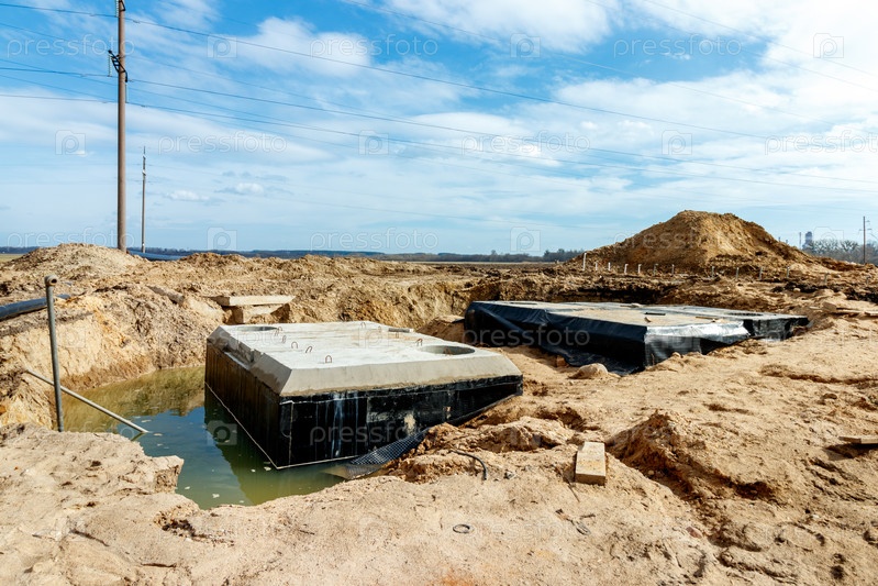 Соединение траншейного водостока с бетонной конструкцией люка на строительной площадке. Бетонная свая в каркасе опалубки для устройства ливневых и подземных коммуникаций, насосных станций, канализационных труб