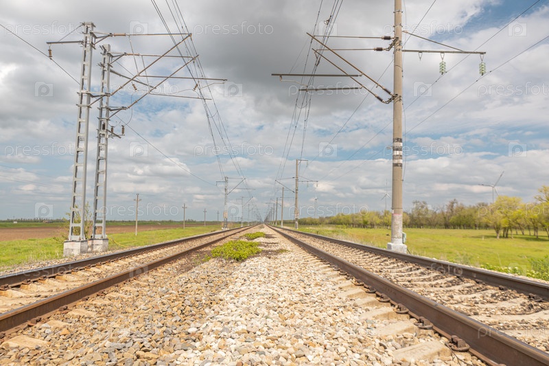Весной железнодорожные пути уходят вдаль, голубое небо с белыми облаками