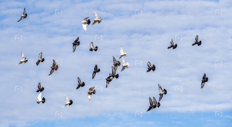 Большая стая домашних декоративных голубей летит на фоне голубого облачного синего неба
