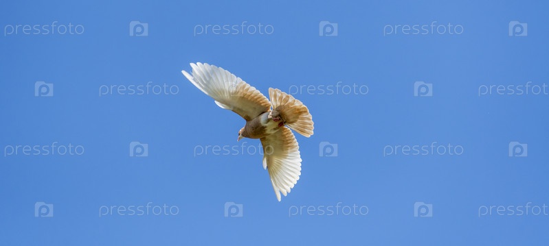 Широко расправив крылья высоко на фоне синего летнего неба летит одинокий бело-коричневый декоративный голубь