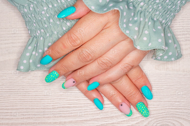 Бирюзовый нейл-арт женский маникюр на светлом деревянном фоне. Длинные ногти миндалевидной формы. Крупный план рук женщины с нежным маникюром на ногтях