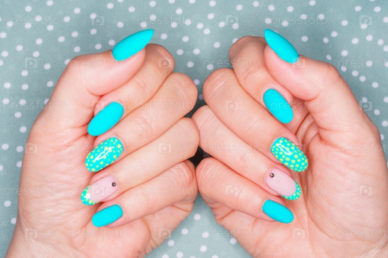 Бирюзовый нейл-арт женский маникюр на светлом деревянном фоне. Длинные ногти миндалевидной формы. Крупный план рук женщины с нежным маникюром на ногтях