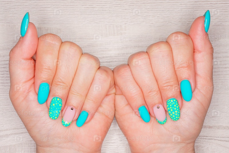Бирюзовый маникюр женский маникюр на светлом деревянном фоне. Длинные миндалевидные ногти. Крупный план женских рук с нежным маникюром на ногтях