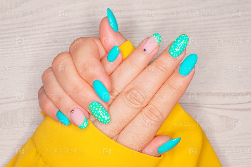 Бирюзовый маникюр женский маникюр на светлом деревянном фоне. Длинные миндалевидные ногти. Крупный план женских рук с нежным маникюром на ногтях