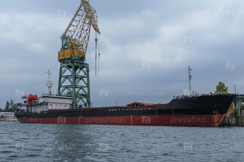 Сухогруз стоит в порту для погрузки или разгрузки. На заднем плане портовый кран и облачное небо