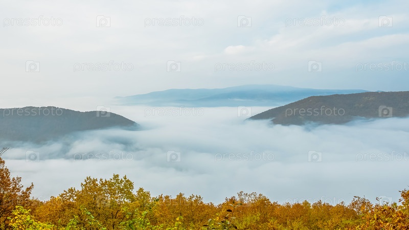 Туманное утро в горном ущелье. Желто-зеленые деревья на переднем плане. Красивые горные пейзажи с туманом над облаками